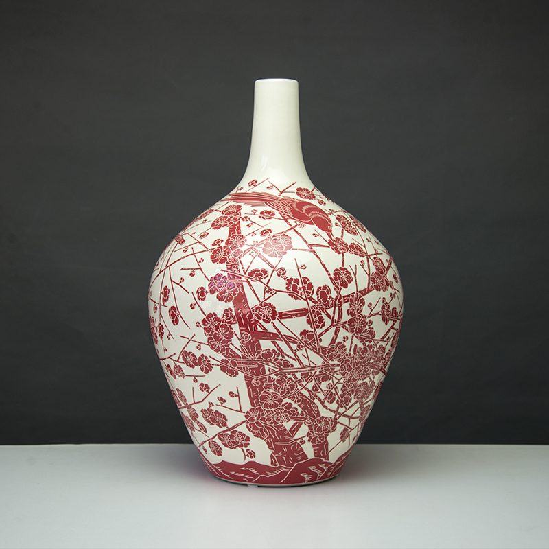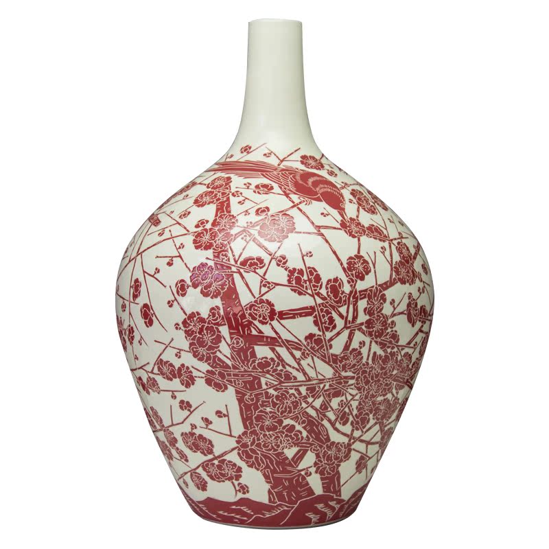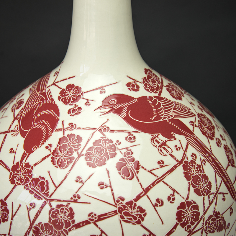 商品名称:磁州窑陶瓷器 高档中国红剔花喜鹊登梅花瓶 现代家饰工艺品摆件