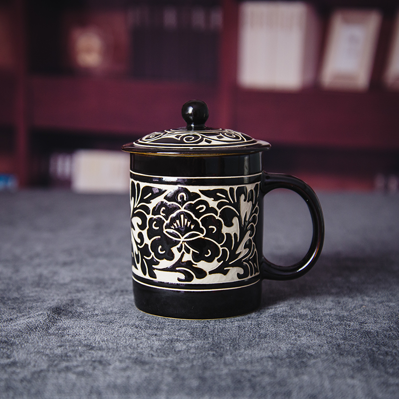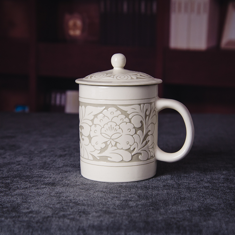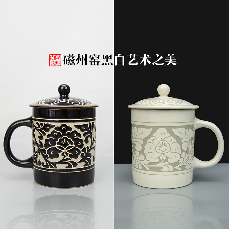 磁州窑茶具陶瓷大水杯带盖手绘雕刻牡丹办公室会议室泡茶杯