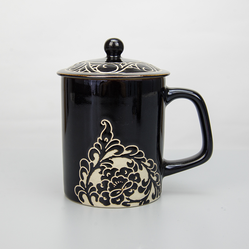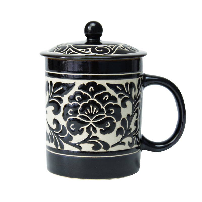 商品名称:磁州窑茶具陶瓷大水杯带盖手绘雕刻牡丹办公室会议室泡茶杯