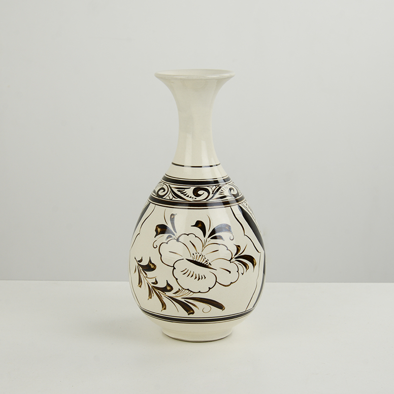 磁州窑仿古花瓶摆件白地黑绘童戏玉壶春瓶插花干花陶瓷手绘客厅